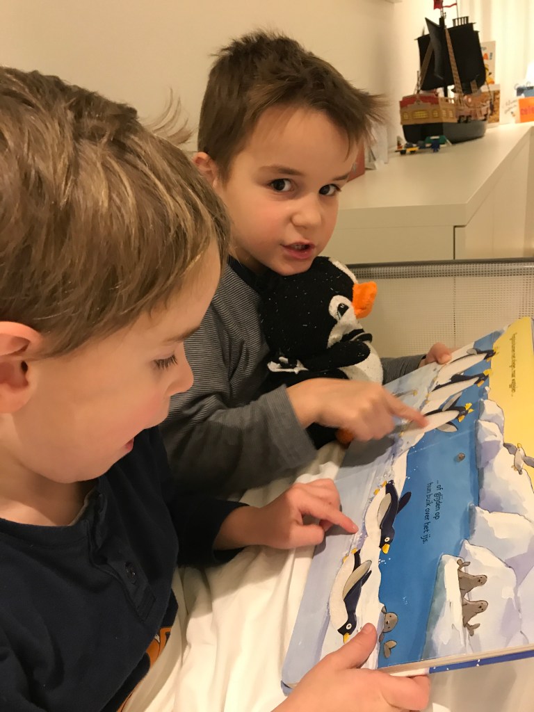 Het zijn onze lievelingsmomenten (voor het slapengaan). Voorlezen aan één of twee kinderen lukt heel gemakkelijk. Aan elke kant zit er een luisteraar. Bij onze drie knapen wissel ik af. Het zorgt anders voor wrevel. Ze willen allemaal dicht bij de voorlezer of bij het boek zitten. Ze houden er nog allemaal van als ik voorlees. De oudsten luisteren gewillig mee naar de prentenboeken voor Jérôme. Ze laten me zien dat het onderwerp er minder toe doet op dat moment. De knusse sfeer, de interactie (bij een zoekboek of bij het napraten achteraf) en het tijd maken voor elkaar zijn fijne elementen voor veel voldoening en een magisch moment.
