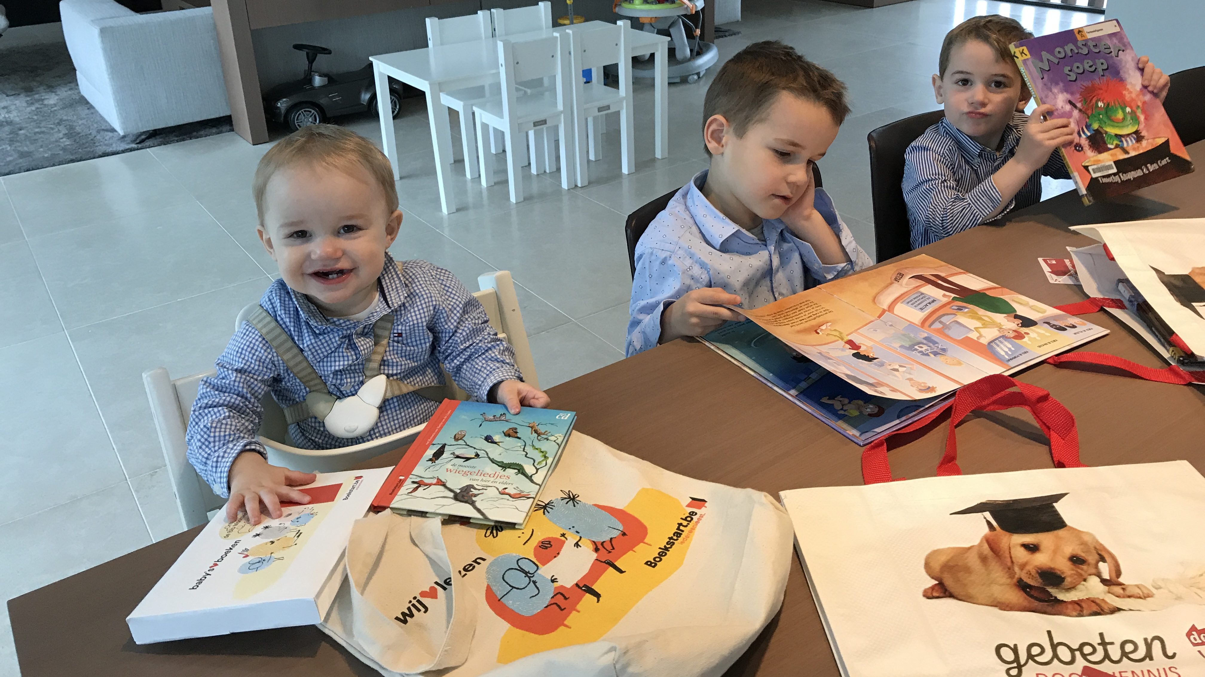 Het is grappig welk effect de bib op onze 3 zonen heeft – ze wanen er zich in een speelgoedzaak. Op de foto zie je (een deel van) de boekenbuit van de jongens. Wat was kleine Jérôme gelukkig met zijn ‘Boekstart-peutertas’ destijds!