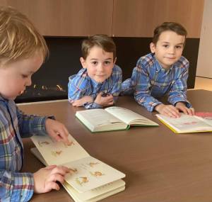 Stilaan kalmeren ze. De eerste pakt voldaan een boek. Meestal volgen de andere twee. De grootste broers lezen en Jérôme bewondert de prenten. Op de foto leest hij in de klassieker ‘Raad eens hoeveel ik van je hou’ van Sam McBratney.