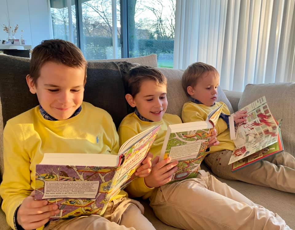 Dagelijks zie ik de broers een boek uit de kast kiezen. Na een vieruurtje, een voetbaltraining, een muziekles of het ravotten ploffen ze zich in de zetel of leggen ze zich op tapijt – in de winter onder een dekentje of dichter bij het haardvuur. Hun ogen dwalen over de zinnen en ze zijn vertrokken.